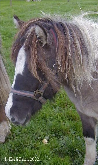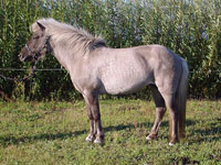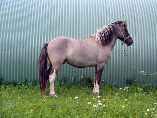 Han var samme farve som Örn da han var føl, men moderen er skimmel og han er blevet en form for farveveksler. Den viste farve om sommeren, næsten sort om vinteren og en gul-grå-brun i mellemtiden. Men bliver nok hvid til sidst.