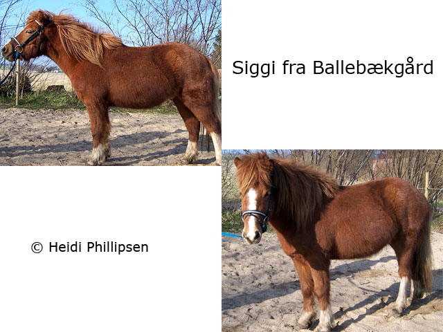 Siggi er, som det ses på billedet, brun med en enkelt hvid stribe ved manen, samt 4 sokker og lidt hvidt på krydset.